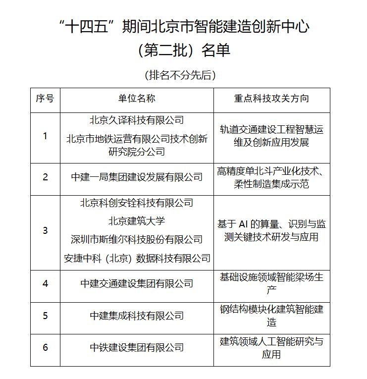 本次遴选经相关单位自主申报、专家评审和论证、市住房城乡建设委审核等程序,确定6家单位(联合体)为“十四五”期间北京市智能建造创新中心”(第二批)最终入选。